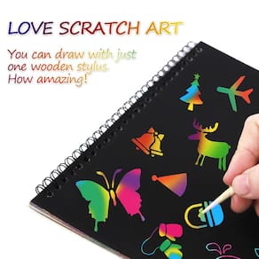 ?? Combinação de 2 cadernos Scratch Art coloridos: inclui 20 páginas encadernadas em espiral e 2 canetas de madeira. (pacote de 10 páginas x 2, tamanho: 10,2 x 7,5 polegadas). Nossas notas Scratch Art apresentam cores vivas que se escondem sob o revestimento fosco; as crianças simplesmente usam a caneta de madeira incluída para revelá-las com um simples arranhão.