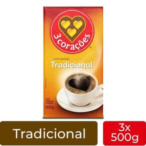 Café 3 Corações Tradicional Torrado e Moído a Vácuo Kit 3 Pacotes de 500g O sabor clássico que conquista gerações