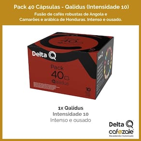 Por que as cápsulas da Delta - Café padrão europeu ao simples toque de um botão. - Cápsulas que preservam todo o sabor e aroma. - Cafés de diferentes regiões do mundo, e variedade de intensidades. - Fabricado em Portugal e vendido no mundo todo. Conteúdo - 1 Caixa de 40 cápsulas Delta . Totalizando 40 cápsulas. Sabor do Café - Qalidus Intensidade 10 Fusão de cafés robustas de Angola e Camarões e arábica de Honduras. Espresso encorpado, com forte presença na xícara, com leve acidez e notas de caramelo. Sem açúcar. Para Cafeteiras Delta - Funcionam perfeitamente em todos os modelos de máquinas Delta . - Modelos: Milk Qool, Qool Evolution, Qlip e Qool Auto. Detalhes do produto - Marca: Delta - Validade: 3 a 6 meses - Modelo: Cafeteiras Delta - Condições de armazenamento: Conservar em local fresco e seco - Fabricado em Portugal Marca: Não Informado Ean: 7908320904585