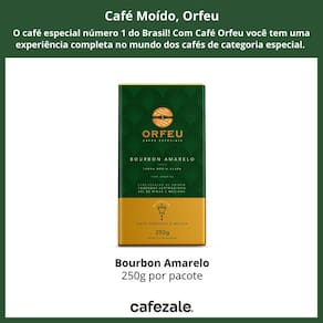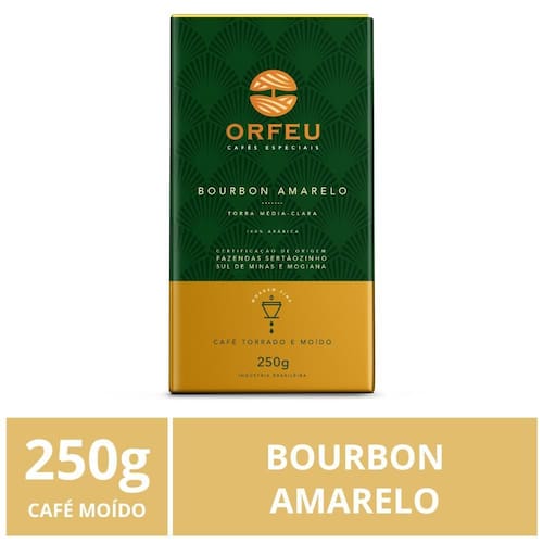 Orfeu Bourbon Amarelo é um café especial moído 100% Arábica, de torra média-clara que apresenta notas cítricas, principalmente de lima e tangerina. Possui corpo baixo, acidez acentuada e aromas e sabores complexos.