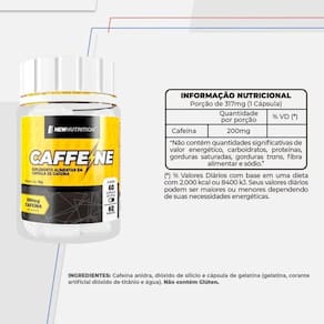 Ingredientes: cafeína anidra, dióxido de silício e cápsula de gelatina gelatina incolor e corantes artificiais: amarelo 6, amarelo 10 e dióxido de titânio . Não contém glúten.