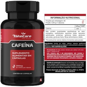 Cafeina 200mg por capsula 60 cápsulas - take care Cafeína 200mg por cápsula 60 cápsulas - take care Descrição A cafeína é uma molécula alcaloide. Essa molécula é uma substância que apresenta ação para o sistema nervoso central, promovendo o aumento do estado de alerta. A cafeína auxilia no aumento da capacidade de resistência e no desempenho de exercícios físicos de resistência. É um suplemento alimentar em cápsulas e um dos seus objetivos é ajudar na redução da fadiga, estimulando o sistema nervoso central, sinônimo de energia, disposição, foco e concentração. Recomendado no pré-treino, sendo capaz de fornecer energia para a prática de exercício físico. Benefícios - apenas 1 cápsula ao dia; - cada dose 1 cápsula fornece 200mg de cafeína; - cada frasco fornece 60 doses/porções; - pode auxiliar no desempenho físico durante os treinos; - pode fornecer maior energia e disposição; - pode reduzir a fadiga; - pode auxiliar no aumento da capacidade de resistência e no desempenho de exercícios físicos de resistência; - não contém glúten. Sugestão de uso Produto indicado para adultos =19 anos . Ingerir 1 uma cápsula ao dia. Tabela nutricional - composição e recomendações Anexo nas imagens. Dados técnicos Registro anvisa - produto dispensado de registro conforme a rdc no. 27/2010, alterada pela rdc no. 240/2018. Marca - take care. Conteúdo líquido total - 60 cápsulas. Rendimento líquido total - 60 doses/porções. Peso líquido total - 33,6g. Peso bruto total - 65g. Peso aproximado produto + embalagem aproximado - 150g. Código de barras ean - 7898411812069. Dimensões do produto - largura: 6cm; altura: 11cm; comprimento: 4,5cm. Dimensões da embalagem/pacote - largura: 13cm; altura: 7cm; comprimento: 16cm. Itens do anúncio 1 unidade do produto: Cafeína 200mg por cápsula 60 cápsulas - take care. Total - 60 cápsulas por frasco. Marca: Não Informado
