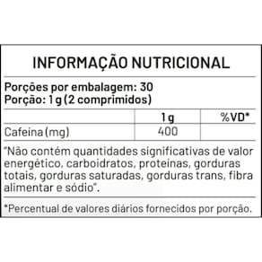 Cafeína 400mg Caffeine Performance A cafeína é um suplemento que pode proporcionar um estado de energia e alerta, podendo maximizar o desempenho em treinos e atividade do dia a dia. A cafeína é encontrada em alimentos como café, chá, cacau e alguns refrigerantes, e é utilizada como um auxilio para intensificação de energia, alerta e desempenho. Muitas pessoas recorrem a suplementos para obter esses benefícios de forma mais rápida, principalmente antes de exercícios. Benefícios: Energizante; Ação Termogênica; 400mg de Cafeína; Aumenta o estado de alerta; Sugestão de Uso: Ingerir 2 comprimidos ao dia, ou antes do treino, ou conforme recomendação profissional. Ean: 7908783800813