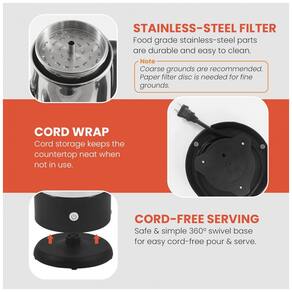 Nota 1 Uma moagem muito grossa, pouco café ou compactação insuficiente do pó antes da infusão podem levar a uma pressão inadequada para uma infusão adequada. 2É importante observar que a quantidade de expresso extraída varia de acordo com o tamanho e a quantidade. da moagem e pode ser necessária uma reprogramação quando o tamanho e a quantidade forem ajustados. Consulte o guia do usuário ou manual do usuário ou guia do usuário fornecido abaixo em PDF antes da primeira utilização. PRONTO PARA SERVIR LUZ indica quando o café está pronto para servir. O botão transparente de progresso da preparação permite visualizar o ciclo de preparação e inclui cesta de filtro permanente de aço inoxidável própria para lava louças. ZENAMENTO DO CABO ENVOLVENTE e pés antiderrapantes, bem como base giratória de 360 para facilitar o serviço sem fio na mesa. Isso torna o Coador totalmente portátil e você pode servir café longe da cozinha, se desejar. VERSATILIDADE NO USO Prepare instantaneamente café quente em menos de 5 minutos. Aqueça até 12 xícaras de água para chá, chocolate quente, aveia ou cereais quentes. ESTILO E DESIGN ERGONÔMICO Apresenta uma alça de toque legal e tampa de encaixe, além de um bico de vazamento de precisão e exterior de aço inoxidável, tornando o o complemento perfeito para qualquer cozinha doméstica