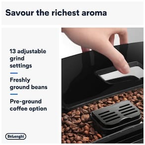A Magnifica S ECAM22.110B é uma máquina de café expresso DeLonghi compacta e superautomática, que permite preparar sua bebida de café com o toque de um botão. Ela possui um moedor ajustável para grãos frescos, com tecnologia de moagem integrada e nível de moagem ajustável, além de moedores cônicos de aço calibrados com precisão. A máquina mói a quantidade exata de grãos, garantindo que sua xícara seja sempre fresca e sem resíduos de café. É possível personalizar o nível de aroma e quantidade desejado para cada receita. Além disso, ela inclui um recipiente de grãos de 250g e uma caixa para café pré moído. O sistema DeLonghi Thermoblock prepara seu café na temperatura ideal, aquecendo apenas a água necessária para cada bebida. A cafeteira também possui um espumador de leite manual para fazer bebidas à base de leite genuínas, e muitos dos componentes removíveis podem ser lavados na máquina de lavar louça para facilitar a manutenção.