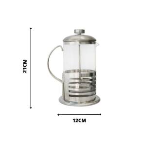 Cafeiteira de prensa francesa em inox com copo de vidro, alça em inox com detalhes na parte que envolve o copo estamapada. O modelo de prensa francesa é muito sofisticado e facilita na preparação de inúmera bebidas, não apenas o café. Ideal também para capuccinos, cremes, leite cremoso, chocolates e demais bebidas de acordo com seu gosto e preferência.