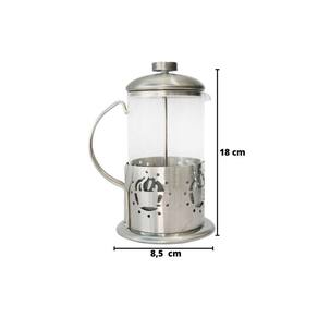 Cafeteira de prensa francesa em inox com copo de vidro, alça em inox com detalhes na parte que envolve o copo estampada. O modelo de prensa francesa é muito sofisticado e facilita na preparação de inúmera bebidas, não apenas o café. Ideal também para cappuccinos, cremes, leite cremoso, chocolates e demais bebidas de acordo com seu gosto e preferência.