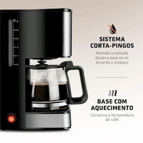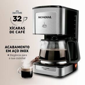 Produto: cafeteira elétrica 800w jarra de vidro 32 xícaras dolce arome - c-44-32x-si marca: mondial voltagem: 110vdescrição: com a cafeteira elétrica 800w jarra de vidro 32 xícaras dolce arome c-44-32x-si da mondial, você garante um café mais saboroso e quentinho para toda a família. A capacidade é de 32 xícaras e o acabamento em aço inox proporciona beleza e um visual moderno para a sua cozinha. Além disso, o c-44-32x-si tem filtro permanente e porta-filtro removível, o que proporciona mais economia e sustentabilidade, pois dispensa a utilização de filtro de papel. Saiba mais sobre a c-44-32x-si: Capacidade: 32 xícaras: são 32 xícaras de um café mais saboroso e quentinho para toda a família. Acabamento em aço inox: a cafeteira elétrica dolce arome c-44-32x-si está disponível na cor preta e com acabamento em aço inox. Garantia de beleza e um visual moderno para a sua cozinha Filtro: economia + sustentabilidade: a cafeteira possui filtro permanente e porta-filtro removível. Ela é ecologicamente correta, pois dispensa a utilização de filtro de papel. O reaproveitamento do filtro proporciona mais economia e sustentabilidade. Função manter aquecido: a base com aquecimento conserva o café quentinho por muito mais tempo e – o melhor – sem alterar o sabor. Sistema corta-pingos: permite a retirada da jarra para servir o café durante o preparo. Jarra de vidro: a jarra é fácil de lavar e não deixa resíduos ou odores. O item também proporciona mais praticidade para levar à mesa e servir. Tampa basculante: mais facilidade na hora de colocar a água e o pó de café. Indicador do nível de água: permite o preparo da quantidade desejada de xícaras de café. Liga/desliga luminoso: a função indica que o produto está em funcionamento e garante maior segurança durante o uso. Acompanha colher dosadora Um ano de garantia mondial: a mondial é a escolha de milhões de consumidores. Mondial, a escolha inteligenteespecificações: cor: preto e inoxmaterial da jarra: vidrocomprimento do cabo: 80cmcapacidade do produto: até 32 xícarasluz indicadora: simbaterias são necessárias: nãotipo de tomada: 10 aalimentação: energia elétricapotência: 800wquantidade em ml por xícara: 40 mlfiltro: porta-filtro permanente.