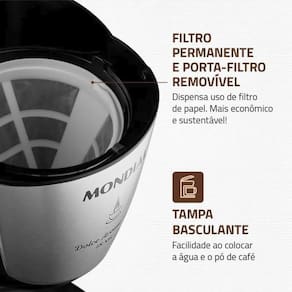 Especificações Técnicas: Marca: Mondial Modelo: C-30-18X-FB Voltagem: 220V Material da Jarra: Vidro Capacidade: 18 xícaras Luz indicadora: Sim Filtro: Removível e Lavável