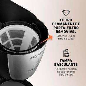 CARACTERÍSTICAS: - Prepara até 30 xícaras - Jarra de inox - Porta-filtro permanente - Base aquecida - Sistema corta-pingos - Tampa basculante - Indicador de nível de água - Luz indicadora