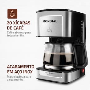 NãoA Cafeteira Elétrica Dolce Arome C-43-20X-SI é indispensável para quem ama um bom café. Capacidade para fazer até 20 xícaras de café, possui filtro permanente com porta-filtro removível que dispensa o uso de filtro de papel, jarra de vidro e sistema corta-pingos para você servir o café durante o preparo. Além disso, possui design moderno e elegante, com acabamento em aço inox. Aproveite a qualidade que só a Mondial tem a oferecer!