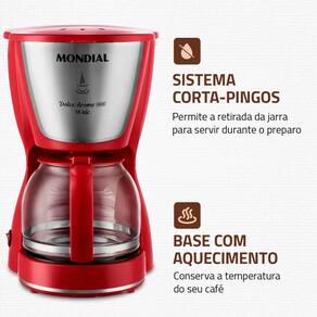 Cafeteira Elétrica Dolce Arome Mondial Vermelho/Inox 550W 220V C-35 18X Comece seu dia com aroma e sabor! A Cafeteira Elétrica Mondial Dolce Arome C-30-18X tem capacidade para servir até 18 xícaras de café. Possui filtro permanente e porta-filtro removível que proporcionam mais sustentabilidade ao meio ambiente. Para conservar a temperatura, conta com jarra de vidro e base com aquecimento. Com design elegante e compacto, é ideal para valorizar o seu cantinho do café. Saiba mais sobre a Dolce Arome C-30-18X da Mondial: