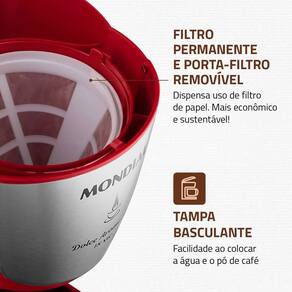 Filtro Permanente e porta filtro removível: A cafeteira é ecologicamente correta, pois dispensa a utilização do filtro de papel. O reaproveitamento do filtro proporciona mais economia e sustentabilidade.