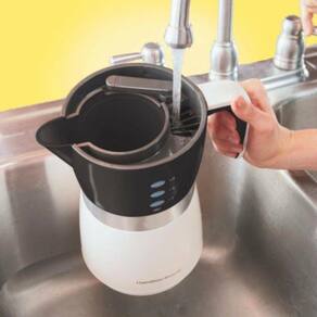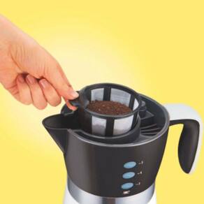 A Cafeteira Elétrica Hamilton Beach permite o preparo do café de forma prática e rápida, sem jarra de vidro para quebrar. O produto, que tem capacidade para até 14 xícaras da bebida, conta com sistema de preparo encapsulado que mantém o café aquecido, além de cesto que dispensa o uso de filtros de papel. Informações técnicas Marca: Hamilton Beach Modelo: 43707BZ127 Voltagem: 127V Inmetro: 00391301/2016 Capacidade: 700ml Dimensões do produto: 26,5 x 22,8 x 15 cm ; 800 g Cor: Preta Garantia: 36 meses Tipo de Refil: Pó, moído Potência: 565W Quantidade de xícaras: Até 14 xícaras Bandeja removível: Sim Tipo de filtro: Permanente Água quente: Não Display: Sim Indicador de nível de água: Sim Luz indicadora: Sim Sistema corta pingos: Sim Conteúdo da Embalagem: 01 Cafeteira 01 Tampa 01 Filtro Permanente 01 Manual Sobre a marca Sempre comprometida com a completa satisfação do cliente e com a inovação, a Hamilton Beach faz parte das mais diversas famílias há mais de 100 anos, trazendo novos produtos, recursos, estilos e cores. A marca número 1 na categoria de eletroportáteis nos Estados Unidos chegou no mercado brasileiro oferecendo 3 anos de garantia e apresentando batedeiras, liquidificadores, cafeteiras, ferros de passar e vários outros produtos para inspirar todo mundo a cozinhar e se questionar: Por que ninguém pensou nisso antes