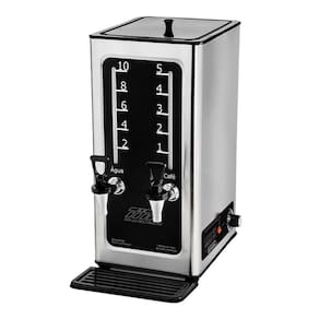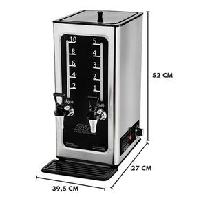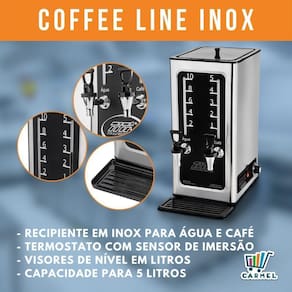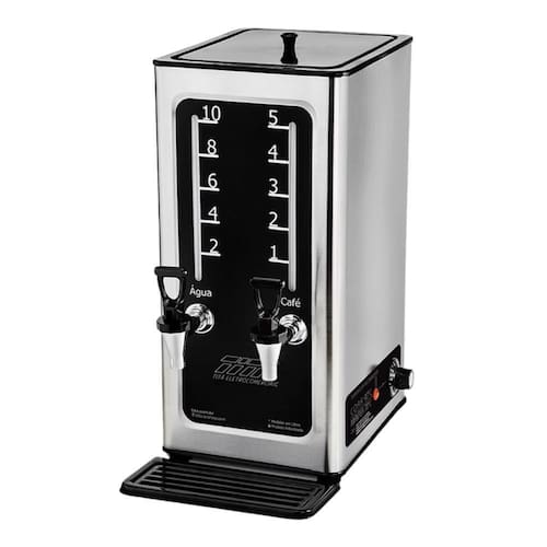 Cafeteira Coffee Line 5 Litros em Inox - TitãA única no mercado que mantém o delicioso e verdadeiro sabor do café coado. Com capacidade para até 5l de café. Mantendo a tradicionalidade, a coffee line traz um design compacto e a eficiência para produzir um café que atende aos paladares mais exigentes. Produto indicado para preparar cafés e chás.Produto livre de estanho:Não são utilizadas ligas de estanho em nossas soldas.Isolamento de temperatura:Além de prevenir queimaduras, o isolamento mantém a temperatura mais uniforme, proporcionando economia de energia.Visores de nível embutidos com escala:Além de proporcionar uma melhor higiene, tem como função um uso mais intuitivo da cafeteira.Torneiras higiênicas:Maior simplicidade de limpeza.Design em formato similar a uma embalagem de café à vácuo:Permite uma grande área para o marketing (personalização da marca).Facilidade de auxílio técnico:Conta com resistência, termostato e coador, todos de linha de mercado, com menor custo de manutenção, que se traduz em economia.Produto certificado:Conforme as normas internacionais, garantindo maior segurança, higiene e exportabilidade do nosso conceito de café.Informações do produto Estrutura fabricada toda em aço inox escovado; tampa superior e pingadeira em alumínio com pintura eletrostática; bojo em aço inox; resistência elétrica em aço inox 304 tubular; termostato capilar com sensor de imersão; fiação elétrica com revestimento em silicone resistente à 300C.Especificações técnicas:Marca: TitãModelo: cafeteira 5 LitrosMaterial: InoxQuantidade de reservatórios: 2 (1 para água e 1 para café)Temperatura máxima: 90 CTemperatura para manter o café aquecido: 70 CTensão: 127v ou 220v (Não é bivolt)Potência: 1300wFrequência: 50-60HzDimensões do Produto:Altura: 52 cmLargura (frente): 27 cmComprimento (lateral): 39,5 cm