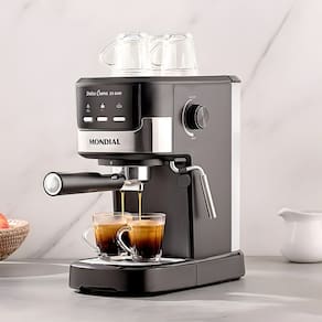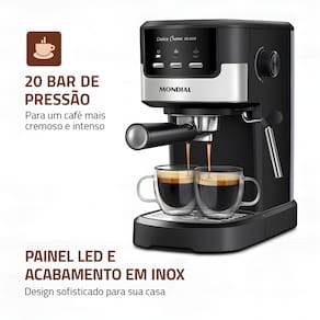 A Cafeteira Espresso Dolce Crema 20 Bar Mondial é perfeita para os amantes de um café encorpado e marcante. Com pressão de 20 Bar, ela extrai os sabores mais ricos e intensos do café moído, resultando em uma bebida cremosa e cheia de aroma. Além disso, a cafeteira também é compatível com adaptadores para bebidas de cápsulas, que são vendidos separadamente.