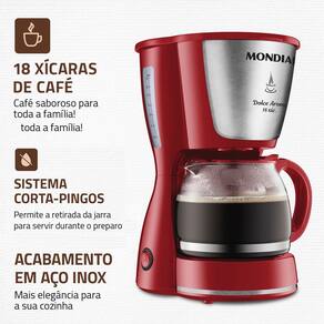Marca: Mondial Modelo: Dolce Arome Ref.: C-35-18X Voltagem (Tensão): 127V e/ou 220V (não é bivolt) Cor: Vermelho com Inox Potência: 550W Consumo: 0,55Kw/h 18 Xícaras De Café: Garantia de um cafezinho saboroso para toda a família. Design Sofisticado: Na cor vermelha e acabamento em aço escovado, a cafeteira proporciona mais elegância à sua cozinha. Filtro Permanente E Porta-Filtro Removível: A cafeteira é ecologicamente correta, pois dispensa a utilização do filtro de papel. O reaproveitamento do filtro proporciona mais economia e sustentabilidade. Sistema Corta-Pingos: Permite a retirada da jarra para servir o café durante o preparo. Jarra De Vidro: A jarra é fácil de lavar e não deixa resíduos ou odores. O item também proporciona mais praticidade para levar à mesa e servir. Base Com Aquecimento: Conserva a temperatura do café. Indicador Do Nível De Água: Permite o preparo da quantidade desejada de xícaras de café. Tampa Basculante: Mais facilidade na hora de colocar a água e o pó de café. Liga/Desliga Luminoso: Indica o funcionamento do produto. Número INMETRO: BRA22/01052
