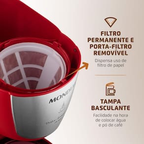 FILTRO PERMANENTE E PORTA-FILTRO REMOVÍVEL: A cafeteira é ecologicamente correta, pois dispensa a utilização do filtro de papel. O reaproveitamento do filtro proporciona mais economia e sustentabilidade.