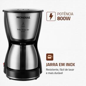 A Cafeteira Elétrica Dolce Arome C-37-JI-30X da Mondial pode preparar até 30 xícaras de café com muita praticidade. Possui filtro permanente e porta-filtro removível que proporcionam mais sustentabilidade ao meio ambiente. Moderna, a jarra em inox é mais durável, fácil de lavar e pode ser levada à mesa. Conta com sistema corta-pingos e base com aquecimento para conservar a temperatura do café por mais tempo.