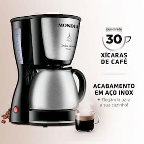 Cafeteira elétrica mondial dolce arome c-37ji-30x 800w inox 127v A cafeteira elétrica c-37-ji-30x prepara até 30 xícaras de café. Com jarra de aço inoxidável, ela tem porta-filtro permanente, que dispensa filtro de papel, sendo mais econômico, ecológico e sustentável por ser lavável. Tem ainda base aquecida para café quente a qualquer hora.