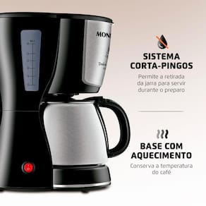Características: - prepara até 30 xícaras - jarra de inox - porta-filtro permanete - base aquecida - sistema corta-pingos - tampa basculante - indicador de nível de água - luz indicadora