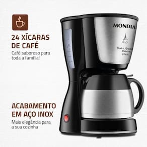 A Cafeteira Elétrica Dolce Arome Thermo C-33-JT-24X pode preparar até 24 xícaras de café com muita praticidade. Possui filtro permanente e porta-filtro removível que proporcionam mais sustentabilidade ao meio ambiente. Conta com jarra térmica em inox que mantém o café quentinho por mais tempo, além da base com aquecimento. Seu design elegante é ideal para valorizar sua cozinha. Saiba mais sobre a Dolce Arome Thermo C-33-JT-24X da Mondial: 24 XÍCARAS DE CAFÉ: Alta capacidade para atender toda a família.