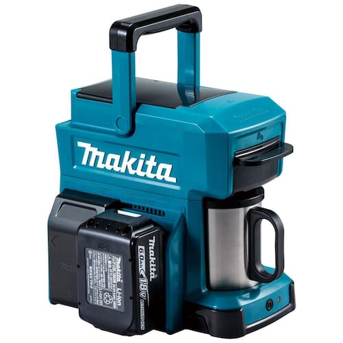Essa cafeteira Makita é alimentada por bateria e leva em 18v, 14,4v e IDK como mas também a velha 10,8v ela diz na caixa e você irá adorar, ela não tem fio e vem com um par de acessórios que são a xícara para beber, é feita de aço inoxidável, mas pesa como se fosse alumínio. uma colher para colher seu café eu também uso para mexer, uma xícara medidora dentro da cafeteira onde você despeja a água em até 250ml basicamente a capacidade máxima recomendada da xícara, 2 recipientes de filtro de café um para filtrar seus grãos de café moído e um para seus pacotes de café os que vêm em sacos , pacotes filtrados também funciona para os seus saquinhos de chá ou simplesmente deixe o na xícara