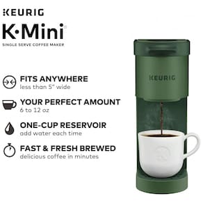 A cafeteira Keurig K Mini em Evergreen apresenta um design elegante com acabamento fosco e, com menos de 5 polegadas de largura, é o tamanho perfeito para qualquer espaço ou ocasião. O brewer K Mini é fácil de usar, basta adicionar água fresca ao reservatório, colocar sua cápsula K Cup favorita, pressionar o botão de preparo e desfrutar de café fresco e delicioso em minutos. Escolha entre centenas de deliciosas variedades de cápsulas K Cup para desfrutar de 6 a 12 onças de seu café, chá, cacau e bebidas geladas favoritos. Com um único reservatório de xícara e zenamento de cabo, a cafeteira K Mini é a cafeteira portátil que torna qualquer lugar perfeito para um ótimo café. A cafeteira K Mini está disponível em uma variedade de cores com acabamento fosco. Com base no feedback do consumidor, atualizamos o K Mini Brewer. As avaliações dos clientes foram removidas relacionadas à versão anterior do brewer.FITS EM QUALQUER LUGAR Menos de 5 polegadas de largura, perfeito para pequenos espaços. SUA QUANTIDADE PERFEITA Prepare qualquer tamanho de xícara entre 6 12 onças com cápsulas Keurig K Cup. ONE CUP RESERVOIR Basta adicionar água fresca para cada brew. FAST FRESH BREWED Café feito em minutos. ZENAMENTO DO CABO Para fácil transporte e bancadas arrumadas. EFICIENTE ENERGÉTICO O recurso de desligamento automático desliga sua cafeteira 90 segundos após a última preparação, ajudando a economizar energia. COMPATÍVEL COM O FILTRO DE CAFÉ REUTILIZÁVEL MY K CUP UNIVERSAL Prepare o seu próprio café moído vendido separadamente. INCLUÍDO NA CAIXA Cafeteira Keurig K Mini. ACABAMENTO MATTE A simplicidade elegante encontra o estilo moderno, a cafeteira K Mini está disponível em uma variedade de cores com acabamento fosco