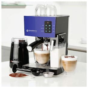 Equipado com o sistema avançado de aquecimento de termoblocos, basta clicar no botão LIGADO e apreciar o estilo italiano de café expresso, cappuccino, café com leite e muito mais em segundos. Basta adicionar grãos Tanque de água grande e destacável de 1,4L com alça conveniente para permitir recargas sem problemas. Batedor de leite e reservatório embutidos com botão de controle ajustável para aquecer e espumar o leite e desfrutar de um delicioso cappuccino e café com leite Máquina de café expresso e cappuccino da série Barista da EspressoWorks com moedor de café elétrico, acessórios Barista, copos de cappuccino de parede dupla e xícaras de café expresso. Esta poderosa máquina aprimora toda a sua experiência com café expresso, cappuccino e café com leite. A bomba de 19 barras cria o creme perfeito, e o sabor o nunca foi tão fácil. Moa seus próprios grãos de café ou café expresso com a textura perfeita, garantindo sempre a bebida mais fresca Colher e adulteração fácil de colher e medir a quantidade ideal de moagem de café expresso. 2 xícaras de café expresso de parede dupla premium e 2 copos de cappuccino de parede dupla de alta qualidade segure as xícaras sem queimar as mãos. Bandeja de aquecimento embutida. Portafilter de alta qualidade com cestas simples e duplas escolha sua quantidade e deixe a máquina fazer o resto. Cada cesto é gravado com uma linha MAX para garantir que a quantidade perfeita seja colocada. Batedor e reservatório de leite embutido com botão de controle ajustável Fácil de encher e limpar. Tanque de água destacável grande de 1.4L O suficiente para hospedar e servir Cada tanque cheio pode fazer até 19 doses de café expresso Tanque de água removível grande com alça fácil de transportar. Alça adicionada permite fácil remoção e reabasteça , limpe na pia. Batedor de leite e reservatório embutidos com botão de controle ajustável. Com apenas um toque, você pode apreciar as bebidas de café expresso em camadas perfeitas, com espuma densa, rica e duradoura em cada xícara do início ao fim. O reservatório de leite pode conter até 500ml de leite. Incluído na sua compra Moedor elétrico plug in de 120V. Porta filtro com alça de baquelite. Cestas de filtro de tiro único e duplo. Colher e adulteração 2 copos de cappuccino de parede dupla de alta qualidade 2 xícaras de café expresso de parede dupla premium 16 xícaras de café expresso de parede dupla premium 16 modelos de estêncil de arte para cappuccino. Guia de início rápido. Painel de controle. Escolha a configuração padrão ou programe sua própria quantidade perfeita de café expresso e leite. Sete botões dedicados com indicadores LED no painel de controle podem ajudá lo a preparar e criar uma lista de bebidas, básicas e personalizadas. Permite escolher uma dose única ou dupla para o seu café expresso, cappuccino ou latte macchiato. Máquina de café expresso e cappuccino com bocal embutido. 7 PC Máquina de café expresso e cappuccino all in one com batedeira a vapor e bocal embutido. Ótimo para amantes de café com leite, cappuccino e café, festas em casa, escritórios e gifting. Tempo de preparação para aquecimento 45 60 segundos. Sistema de aquecimento avançado com termobloco Steamer de leite. Espuma automática com tanque de leite removível. Espuma manual. Varinha de vapor. Capacidade do tanque de água 1.4L 1.25L. Acessórios Moedor de grãos de café, Colher, calcadeira, Portafilter, Cesta de filtro de tiro único, Cesta de filtro de tiro duplo, 2 xícaras de cappuccino, 2 xícaras de café expresso, Modelos de estêncil de arte. Duplo Cesta do filtro de injeção, 2 xícaras de café expresso em cerâmica, jarro para espuma de leite. Dimensões 21,5cm x 25,4cm x 30,5cm. A 25cm x 23cm x 29cm. Recurso de desligamento automático. Potência 1250W 1350W