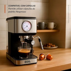 Cafeteira Espresso EOS 2 em 1 Italiana Inox com 20 Bar de pressão, ideal para cafés encorpados, cappuccinos e lattes. Possui espumador de leite integrado e design moderno em inox.Pressão