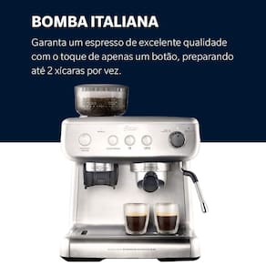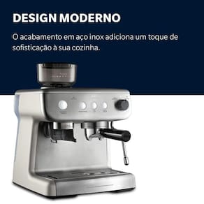 Viva a experiência do melhor café expresso no conforto do seu lar. Tecnologia 3 em 1: Moedor Integrado, Bomba Italiana, Controle de Temperatura e Pré-Infusão.