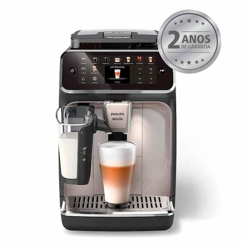 Cafeteira Espresso Superautomática Philips Walita LatteGo Série 5500 com 12 níveis de moagem, moinhos de cerâmica, 15 bars de pressão, painel touch, 12 variedades de bebidas e compatibilidade com café moído.Moedor de café integrado