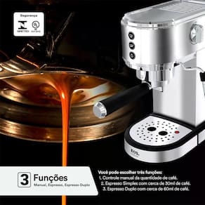 A Cafeteira Expresso EOS chegou para garantir um cafezinho perfeito, sem esforço, toda em inox a cafeteira Eos é a junção de beleza e praticidade, dando um toque mais moderno para sua cozinha. Com 3 funções em um único produto, ela tem programação de expresso simples, duplo e café manual, além de ser compatível com cápsulas de Dolce Gusto, Nespresso e ainda possuir um espumador de leite, permitindo fazer latte, cappuccino e diversos outros tipos de café que você escolher, transformando você em um verdadeiro barista. Com tecnologia italiana, em sua bomba com 19 bar de pressão, ela passa seu expresso de forma rápida, em apenas 25 segundos. Além de tudo isso conta com um tanque tamanho família, de 1 litro, para que você não precise ficar se preocupando com a água de forma constante.