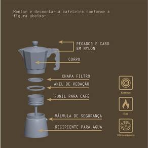 Cafeteira italiana em alumínio, 320ml de capacidade, cabo em nylon, preta.Moedor de café integrado