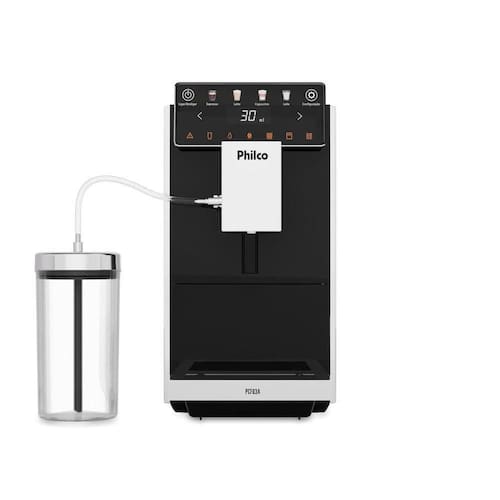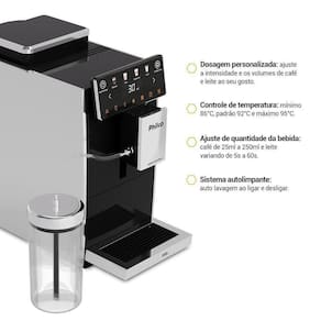 A Cafeteira Philco conta com reservatório de leite de 680ml, permitindo preparar cappuccinos, lattes e leite espumado de forma automática. A quantidade da bebida é personalizável, com ajuste de café entre 25 e 250ml e controle do tempo do leite. O painel amplo e intuitivo facilita o uso até para iniciantes.