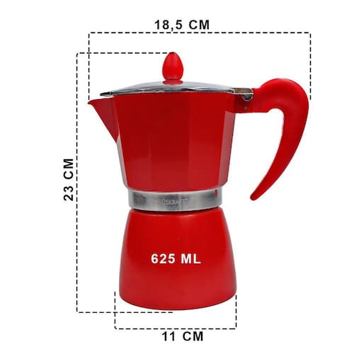 CAFETEIRA ITALIANA 9 XÍCARASSKU: CAFT-009VMCOR: VermelhaMarca: HauskraftCapacidade: 625mlEspessura: 1,5mmServe até 9 xícaras de aproximadamente 70mlCom a cafeteira italiana Hauskraft para 9 xícaras fica muito mais fácil de preparar aquele delicioso café. Fabricada em alumínio, ela possui válvula de proteção, borrachas de vedação e filtro de excelente qualidade. Completamente desmontável, a cafeteira à pressão prepara o café por meio de vapor de água e o resultado é uma deliciosa bebida de gosto acentuado e aroma que invade a casa. Design clássico e de fácil limpeza, resistente e durável.- Dicas de uso:• Antes do primeiro uso, lave a cafeteira com detergente neutro, esponja macia e água.• Nunca encha a cafeteira até a tampa.• Ao aquecer o líquido manuseie a cafeteira sempre com muito cuidado.• Ferva o líquido na temperatura média com detergente neutro.• Para manter o líquido aquecido por mais tempo, mantenha a tampa fechada.- Limpeza e conservação:• Antes de utilizar, remova as etiquetas e lave a sua cafeteira com uma esponja macia, utilizando sabão neutro.• Enxugue bem com um pano macio, e já estará pronto pra usar.• Para manter a cafeteira limpa e conservada, basta lavar com água, detergente ou sabão neutro, utilizando uma esponja macia.• Enxugue a sua cafeteira imediatamente após a lavagem para prevenir manchas.• Não é recomendado lavar em máquina de lavar louça.- Instruções de uso:• Nunca deixe a cafeteira vazia ao fogo.• Utilize somente líquido.