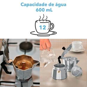 Cafeteira Italiana 12 Xícaras Café Manual Dispensa Filtro DESCRIÇÃOA cafeteira italiana é totalmente desmontável para a limpeza e tem um tamanho de 23cm.Serve 12 xícaras de café, feitos sob pressão, com um sabor autêntico e delicioso. Não é necessário filtro e seu material é feito de alumínio com uma válvula de proteção.Resistente e durável.CARACTERÍSTICASMaterial: Alumínio Capacidade: 12 xícaras Capacidade de água: 600mlDimensões: 11x18cmAltura: 23cm