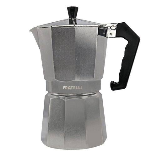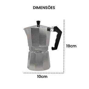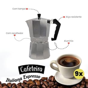 Cafeteira Italiana Express faz 9 Xícaras Produzida com material de alta qualidade e segurança, traz mais praticidade para seu cafezinho do dia a dia. A cafeteira Italiana tem um processo de pressão, modelo tradicional europeu. O processo de preparação do café é feito de baixo para cima. A água ferve na caldeira, passa pelo pó do café que está no funil e por fim, o café chega no recolhedor e está pronto para ser servido. Dispensa o uso de filtros de papel ou de pano. Faz de 01 (uma) a 09 (nove) xícaras. ESPECÍFICAÇÕES:Tamanho: 10cm Diâmetro x 19cm Altura Material: Alumínio - Faz até 9 xícaras Contém:01 Xícara Italiana