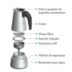 Modo de Uso: Use um pano macio para limpar resíduos de café. Nunca use palhas de aço ou produtos abrasivos na Cafeteira Italiana Tramontina. Depois de lavar, seque completamente a cafeteira antes de montá-la outra vez. Antes do primeiro uso e regularmente (porém não necessariamente a cada uso), remova e lave também a borracha de vedação e a placa redonda do filtro. Substitua a borracha de vedação se ressecar, rachar ou se notar que o vapor está escapando da rosca entre a parte de cima e a de baixo.