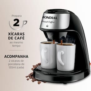 A Cafeteira 2 Xícaras Smart Coffee C-42-2X-BI foi desenvolvida para passar dois cafés, ao mesmo tempo, na medida certa e direto na xícara. Possui filtro permanente com porta-filtro removível que dispensa o uso do filtro de papel, tampa basculante e bandeja removível antiderrapante, além de design moderno com acabamento em aço inox. Acompanha 2 xícaras de porcelana e 1 colher dosadora. Saiba mais sobre a C-42-2X-BI da Mondial: