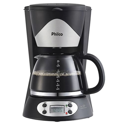 Já imaginou acordar com aquele cheirinho de café no ar A Cafeteira Digital Philco Inox pode fazer disso uma realidade! Conta com função timer que permite programar o horário do preparo do café com até 24h de antecedência. Muito prática, pois faz até 14 cafezinhos. Você nem precisa esperar o café terminar de passar, porque o sistema corta-pingo permite que você retire a jarra enquanto o café está sendo preparado. Mas se você esquecer, não se preocupe, a placa aquecedora mantém seu café quente por até 2 horas sem alterar o sabor. Tem reservatório com graduação que indica o nível de água. E acompanha colher dosadora para a dosagem exata do café.