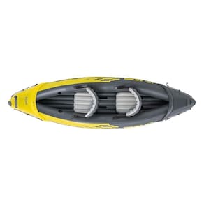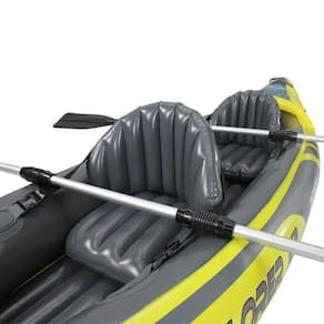 Caiaque inflável com capacidade para 2 pessoas. Seu inovador desenho favorece o processo de remar. Inclui quilha removível, assentos com encosto inflável e ajustáveis, remo de alumínio de 219cm, bomba manual e kit de reparação. Peso máximo 180Kg.Alem do conforto, seu design torna fácil o remar em ambos os lagos e rios suaves, tudo, permanecendo leve e compacto. Sua cabine de pilotagem dispõe de dois bancos ajustáveis com encostos. Feita de robusto vinil de calibre 30 super-resistente para maior durabilidade.