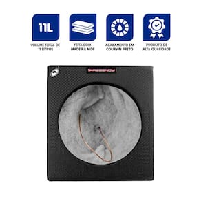 CARACTERÍSTICAS - Dimensões compactas, ideal para instalar em caçambas de pick-ups ou espaços laterais - apertados do veículo; - Volume acústico eficiente: estrutura selada com 11 litros internos, proporcionando controle de pressão e graves mais definidos; - Acabamento resistente: MDF de 15–18 mm com revestimento de courvin perfurado preto e manta isolante acrílica, assegurando isolamento acústico e durabilidade; - Fixação e montagem segura: plugs parafusados com fio e cola branca com serragem garantem encaixe firme e resistente à vibração.