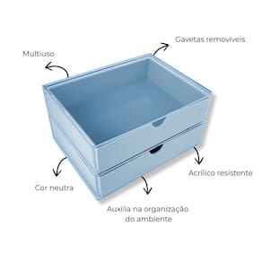 Características principais - acrílico resistente; - design funcional; - 2 gavetas deslizantes; - usos diversos; - a primeira gaveta possui visão total pela parte superior da caixa; - funcional; - cor azul claro que combina com o ambiente; - ideal para quem busca praticidade e organização.