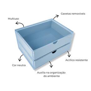 Características principais - acrílico resistente; - design funcional; - 2 gavetas deslizantes; - usos diversos; - a primeira gaveta possui visão total pela parte superior da caixa; - funcional; - cor azul claro que combina com o ambiente; - ideal para quem busca praticidade e organização.