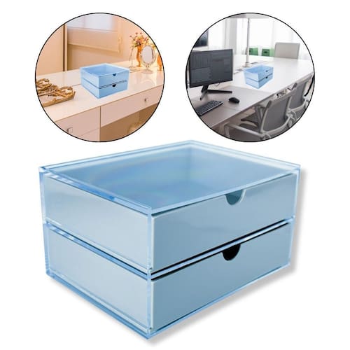 Características principais - acrílico resistente; - design funcional; - 2 gavetas deslizantes; - usos diversos; - a primeira gaveta possui visão total pela parte superior da caixa; - funcional; - cor azul claro que combina com o ambiente; - ideal para quem busca praticidade e organização.