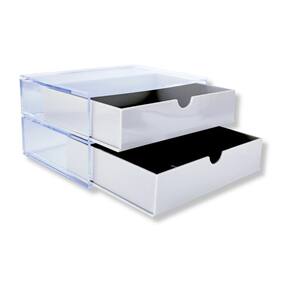 A caixa organizadora multiuso com duas gavetas, fabricada com materiais resistentes, é composta por uma estrutura acrílica transparente que proporciona durabilidade e um aspecto sofisticado, permitindo a fácil visualização dos itens armazenados. Com duas gavetas deslizantes, ela oferece versatilidade para guardar objetos de diferentes tamanhos e categorias, elas poussuem recortes semicirculares na frente para facilitar a abertura sem a necessidade de puxadores adicionais.