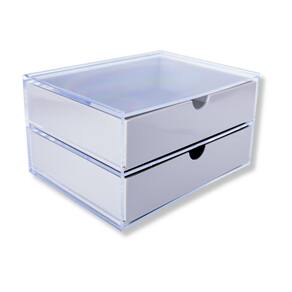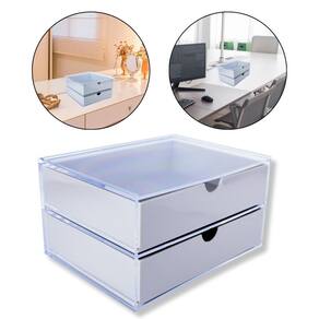 A caixa organizadora multiuso com duas gavetas, fabricada com materiais resistentes, é composta por uma estrutura acrílica transparente que proporciona durabilidade e um aspecto sofisticado, permitindo a fácil visualização dos itens armazenados. Com duas gavetas deslizantes, ela oferece versatilidade para guardar objetos de diferentes tamanhos e categorias, elas poussuem recortes semicirculares na frente para facilitar a abertura sem a necessidade de puxadores adicionais.