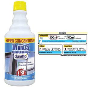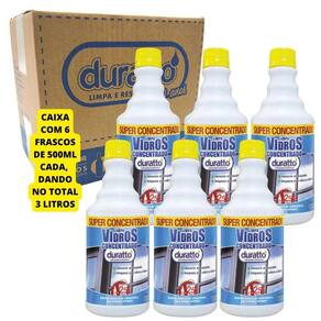 Caixa 6 limpa vidros concentrado duratto 500ml cada Caixa com:6 limpa vidros concentrado duratto 500ml cada, total de 3 litros. Este produto é indicado para limpeza pesada pós-obra, recuperação e remoção e manutenção e em superfícies de vidro. Descrição- não deixa resíduos;- remove marcas dágua manchas e respingos ;- produto de baixa espuma;- dispensa enxágue;- rende muito;- ideal para limpeza pós-obra mais concentrado ou manutenção mais diluído . Embalagem: 500ml Produto concentrado para diluir Modo de usar1- diluir o produto conforme a tabela abaixo;2- aplicar sobre a superfície utilize um pulverizador ;3- deixar o produto agir 1 minuto ao menos ;4- remover o excesso com um rodo ou enxaguar com água;5- secar se necessário.