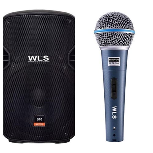 Kit composto de 01pç Caixa Acústica WLS S10 Ativa com Bluetooth + 01pç Microfone M58A